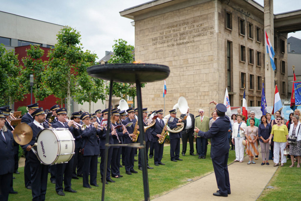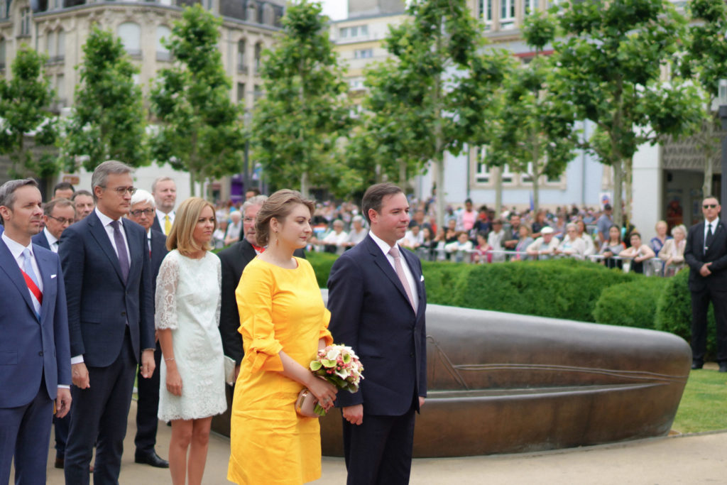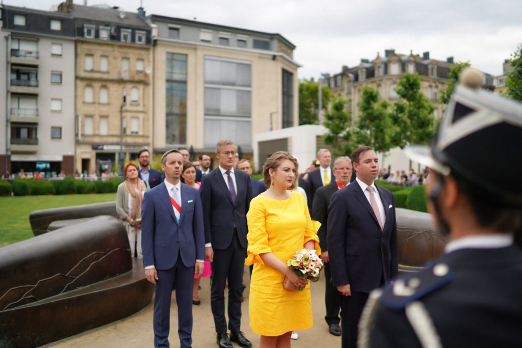 - 17h10 Dépot de fleurs au Monument aux Morts par Leurs Altesses Royales. Encadrement musical : Harmonie Municipale d’Esch-sur-Alzette et Chorale Municipale Uelzecht